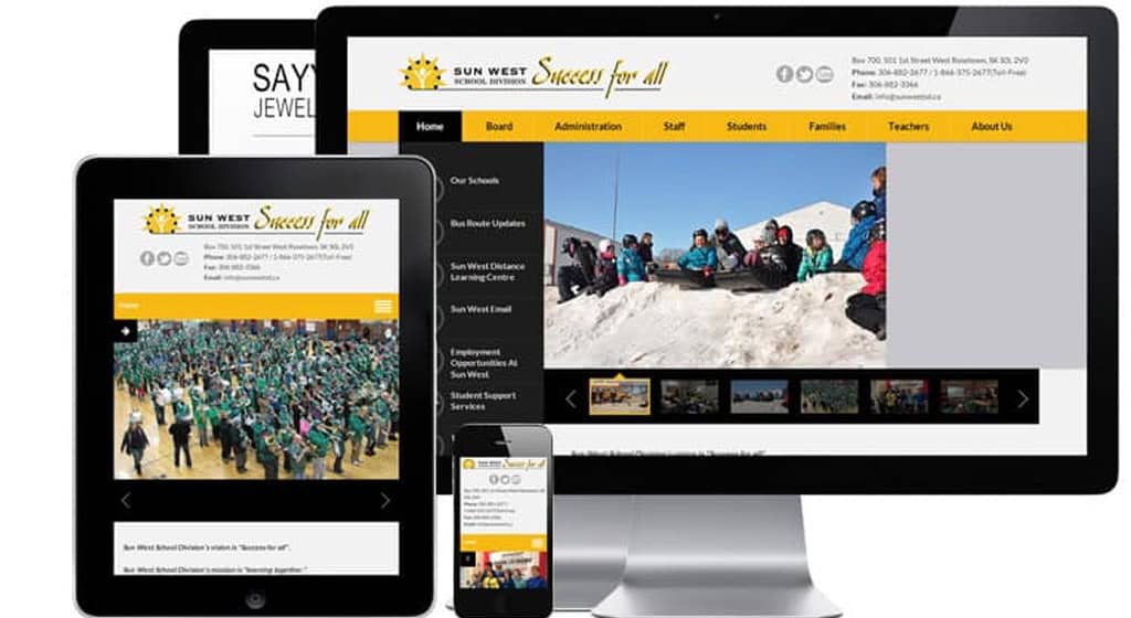 A recent responsive web design project of ours has been for Sun West School Division (referred to as “SWSD”) located in West-Central Saskatchewan. SWSD is governed by a Board of Education consisting of 9 elected representatives responsible for an overall budget of nearly 60 million dollars. The School Division administers 40 schools, which include fourteen K-12 schools, seven elementary schools, three high schools, and sixteen Hutterite Colony schools.