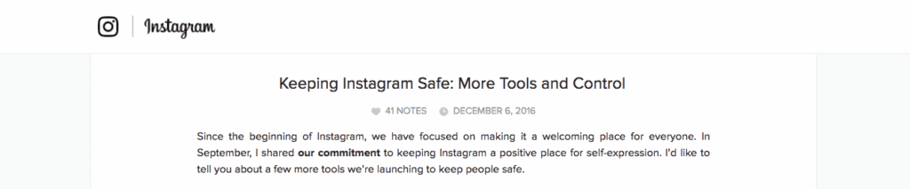 Dec. 6, 2016 – Instagram launches ability to turn off comments on any post as well as ability to “like” comments to show support and encourage engagement.